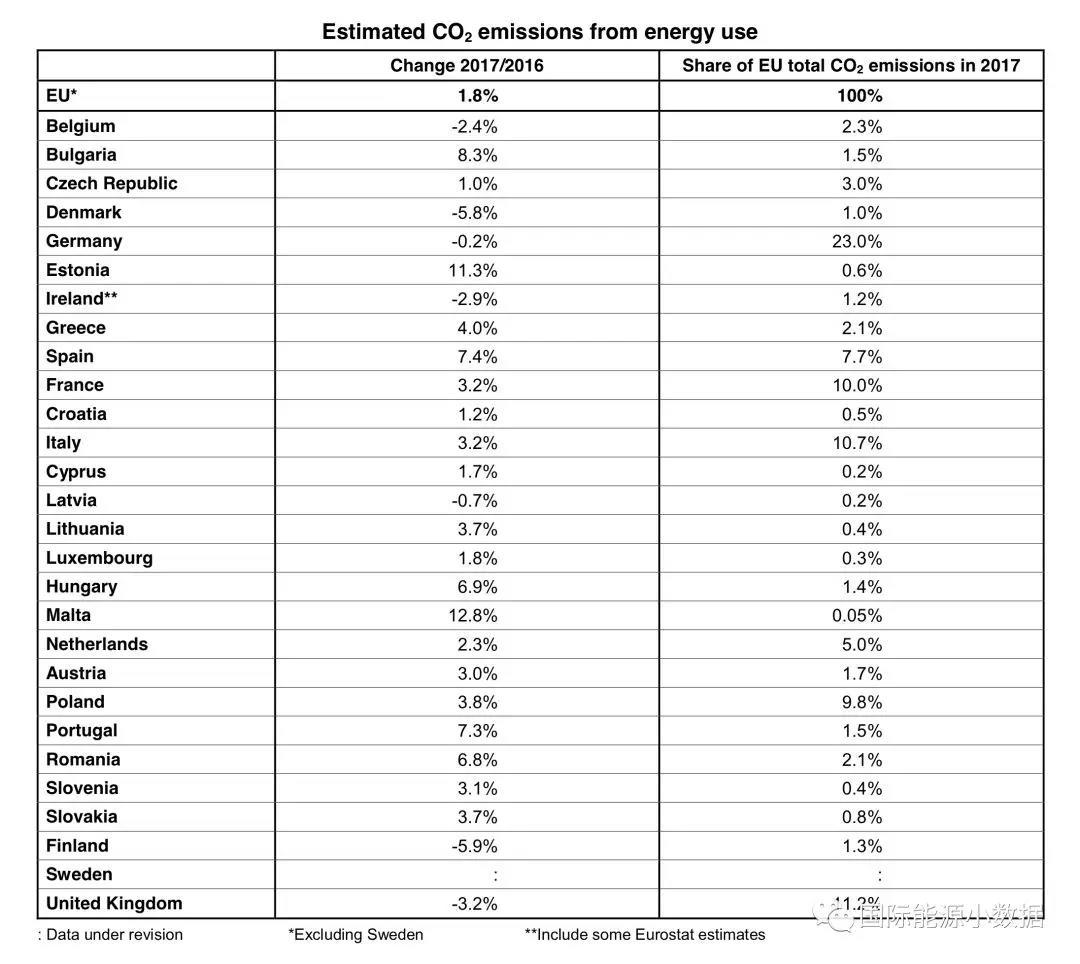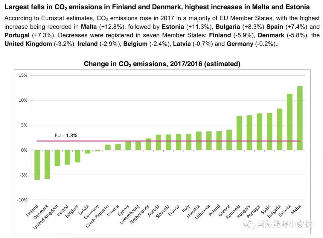 中國儲能網訊:根據Eurostat剛剛發(fā)布的數(shù)據,2017年歐盟國家能源相關的碳排放比2016年增長1.8%。歐盟國家中排放增長幅度比較大的國家有:馬耳他(+12.8%)、愛沙尼亞(+11.3%)、保加利亞(+8.3%)、西班牙(+7.4%)、葡萄牙(+7.3%);排放減少的國家有:芬蘭(-5.9%)、丹麥(-5.8%)、英國(-3.2%)、愛爾蘭(-2.9%)、比利時(-2.4%)、拉脫維亞(-0.7%)、德國(-0.2%)。