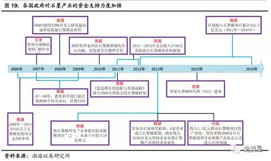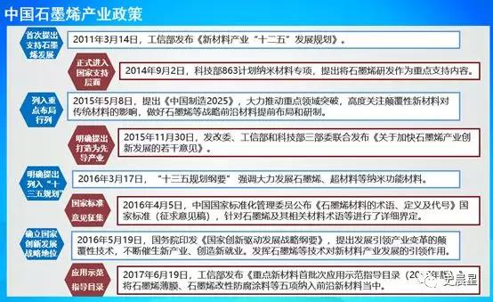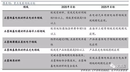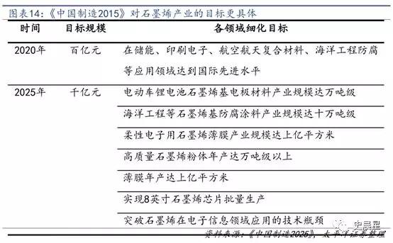 《中國制造 2025》明確了石墨烯發(fā)展目標,2020 年“規(guī)模制備及電化學儲能、印刷電子、航空航天用輕質高強復合材料、海洋工程防腐等應用領域的技術水平達國際領先,大幅提升相關產(chǎn)品性能,形成百億元產(chǎn)業(yè)規(guī)模,2025 年突破石墨烯在電子信息領域應用的技術瓶頸,整體產(chǎn)業(yè)規(guī)模突破千億。