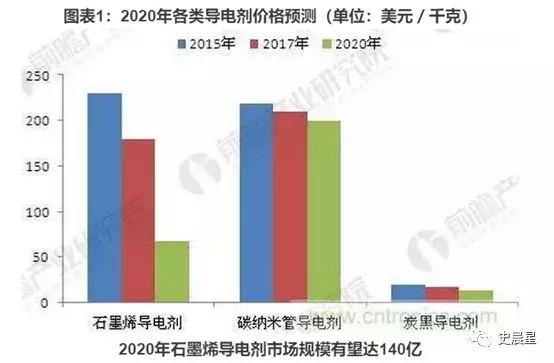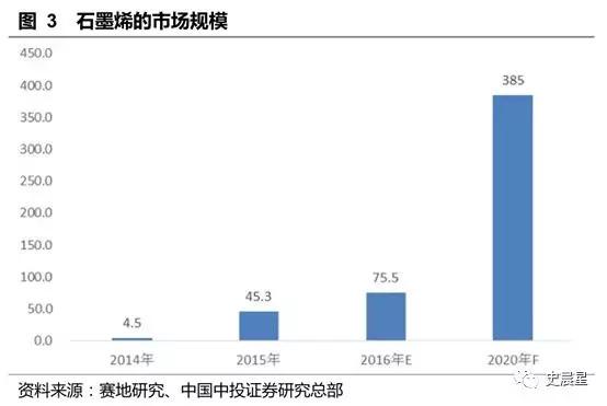 石墨烯作為工業(yè)添加劑,材料本身市場規(guī)模并不大,各機構預測到 2020 年石墨烯材料本身市場規(guī)模在 1.5-3 億美元之間,并在 2015-2020 年期間保持 40% 以上增速。