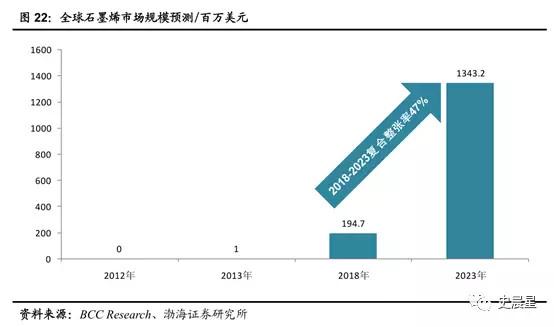 但石墨烯作為基礎材料,下游應用領域極為廣闊,美國 BCC Research 預測,2018 年全球石墨烯整體市場規(guī)??赡芨哌_ 1.95 億美元,2023年石墨烯應用規(guī)模將達到 13.43 億美元,復合增長率 47%。