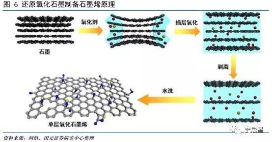 基本原理:先利用強氧化劑(高錳酸鉀、濃硫酸)與溶液中石墨反應,使石墨片層間帶上羧基、羥基等基團,生成氧化石墨。隨后將氧化石墨分散于溶劑或水中,使用超聲波振蕩處理,形成分散均勻的單層氧化石墨烯分散液。接著使用不同的還原劑或還原方法對氧化石墨烯進行還原,以除去片層上的大多數(shù)含氧官能團,最后得到石墨烯。
