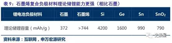 石墨烯是由單層碳原子緊密排列構成,鋰離子不僅可以存儲在石墨烯片層的兩側,還可以在石墨烯片層的邊緣和孔穴中存儲,其理論比容量為740~780mAh/g,為傳統(tǒng)石墨材料的 2 倍多,但遠低于硅 4200 mAh/g,目前主流方向是硅碳負極。