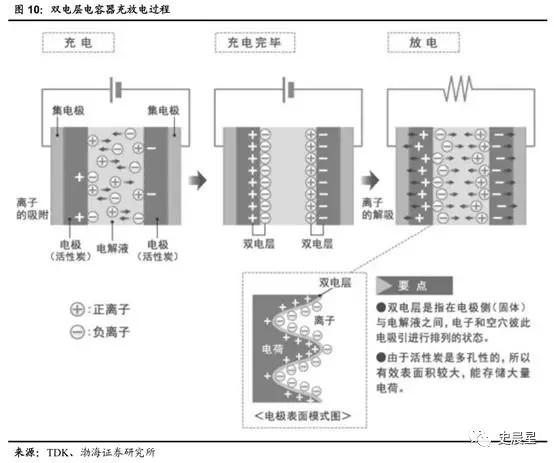 超級電容器可以被視為懸浮在電解質中的兩個無反應活性的多孔電極板,在極板上加電,正極板吸引電解質中的負離子,負極板吸引正離子,形成兩個容性存儲層。