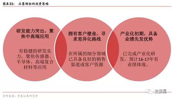 針對石墨烯產(chǎn)業(yè)的當前特點,建議重點關注研發(fā)實力雄厚,具備產(chǎn)品質量和客戶資源壁壘,或者在產(chǎn)業(yè)化階段已經(jīng)占據(jù)先發(fā)優(yōu)勢的石墨烯標的。