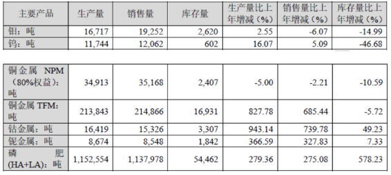 洛陽鉬業(yè)2017年產(chǎn)銷量情況分析表: