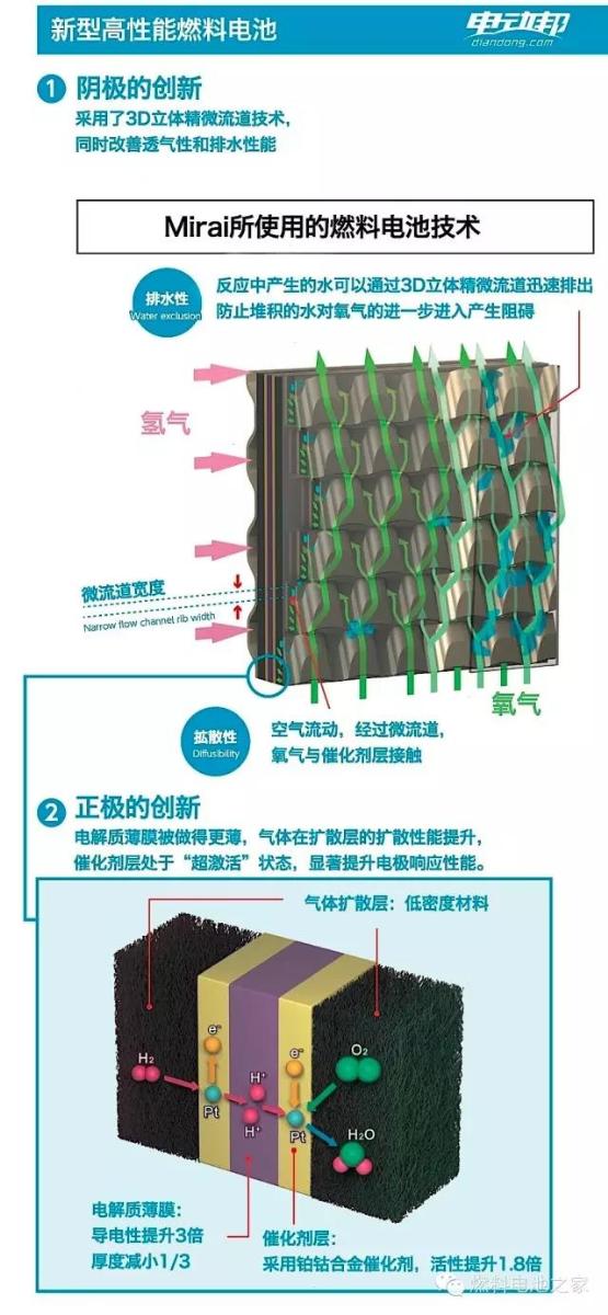 因?yàn)闅浞肿芋w積小,可以透過薄膜的微小孔洞游離到對面去,但是在穿越孔洞的過程中,電子被從分子上剝離,只留下帶正電的氫質(zhì)子通過,氫質(zhì)子被吸引到薄膜另一側(cè)的電極與氧分子結(jié)合。電解質(zhì)薄膜兩側(cè)的電極板將氫氣拆分成氫離子(正電)和電子、將氧氣拆分成氧離子(負(fù)電)和電子,電子在電極板之間形成電流,兩個(gè)氫離子和一個(gè)氧離子結(jié)合成為純水,是反應(yīng)的廢物。所以本質(zhì)來講,整個(gè)運(yùn)行過程就是發(fā)電過程。因此Mirai是純電動(dòng)車,燃料電池堆棧代替的就是厚重且充電效率低下的鋰離子電池組。