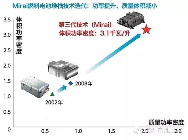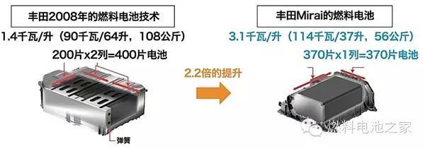 豐田Mirai搭載的燃料電池堆棧是由370片薄片燃料電池組成的,因此被稱為“堆?!?,一共可以輸出114千瓦的發(fā)電功率。此前我們也分析了大眾集團(tuán)的燃料電池技術(shù),結(jié)構(gòu)基本類似。豐田的燃料電池堆棧經(jīng)歷了十幾年的技術(shù)優(yōu)化,形成了自己的特色結(jié)構(gòu),比如3D立體微流道技術(shù),通過更好地排出副產(chǎn)物水,讓更多空氣流入,有效改善了發(fā)電效率。所以整個(gè)堆棧的發(fā)電效率達(dá)到了世界先進(jìn)水平,達(dá)到了3.1千瓦/升,比2008年豐田的技術(shù)整整提升了2.2倍。