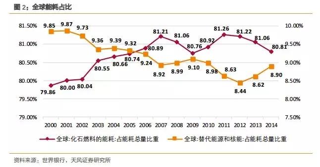 在能源消耗結(jié)構(gòu)來看,化石燃料能耗占比在2000年前不斷增加,而從2011年的81.26%開始下降,至2014年減少到了80.81%;相對而言,替代能源和核能的占比則在這四年間也從8.44%一路穩(wěn)步增加至8.90%。雖然增減幅度還較小,但從中可見清潔化趨勢在逐漸加強(qiáng)。
