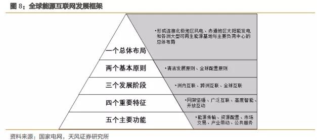全球能源互聯(lián)網(wǎng)的發(fā)展框架可以概括為一個總體布局、兩個基本原則、三個發(fā)展階段、四個重要特征、五個主要功能。全球能源互聯(lián)網(wǎng)將形成由跨州電網(wǎng)、跨國電網(wǎng)、國家泛在智能電網(wǎng)組成,各層級電網(wǎng)協(xié)調(diào)發(fā)展的總體布局,堅持清潔發(fā)展和全球配置兩個基本原則,經(jīng)過洲內(nèi)互聯(lián)、跨洲互聯(lián)、全球互聯(lián)三個階段,具備網(wǎng)架堅強(qiáng)、廣泛互聯(lián)、高度智能、開放互動四個重要特征,實現(xiàn)能源傳輸、資源配置、市場交易、產(chǎn)業(yè)帶動和公共服務(wù)五個主要功能。
