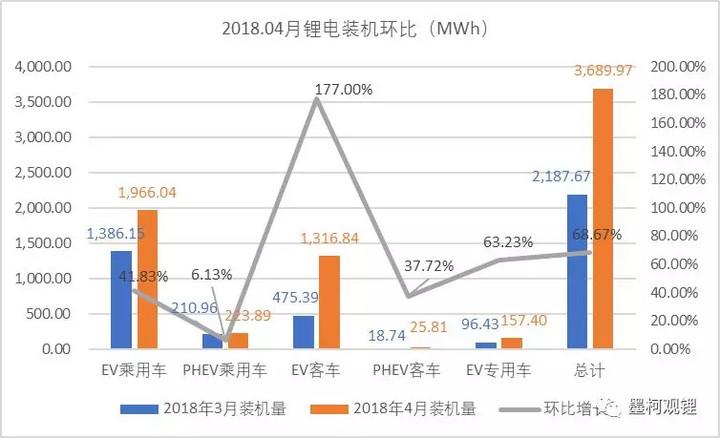 中國儲能網(wǎng)訊:真鋰研究的統(tǒng)計數(shù)據(jù)顯示,2018年4月中國電動汽車市場實現(xiàn)鋰電裝機3.69GWh,同比增長261.56%,環(huán)比增長了68.67%。在國家補貼政策的過渡期,各企業(yè)還是謹慎生產(chǎn),平穩(wěn)發(fā)展。