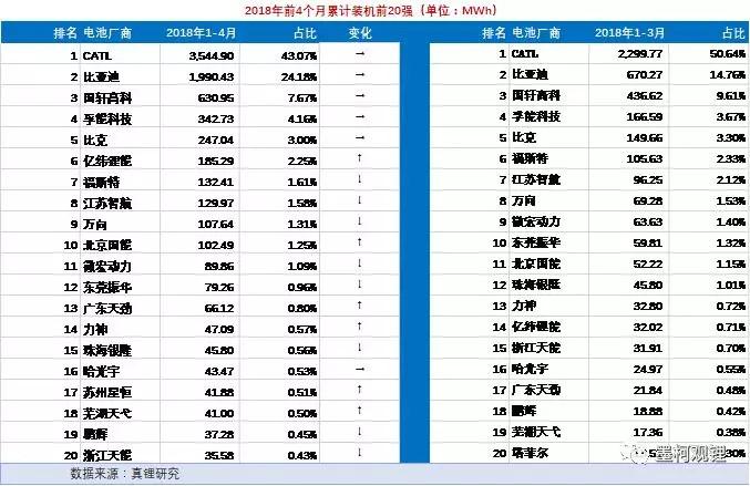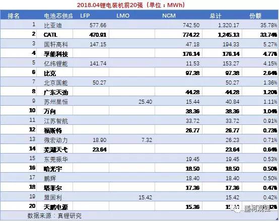 從電池廠商看,前4個月CATL以3.54GWh的總裝機量繼續(xù)排在首位,但市場份額下降到43.07%。比亞迪以1.99GWh占比24.18%排名第二,市場份額增長近10%,在快速拉近與CATL的差距。3-5名依次是國軒高科、孚能科技和比克。與一季度相比,前5名排名沒有發(fā)生變化。進步較快的是億緯鋰能,由1季度的第14名上升到目前的第6名。自爆發(fā)債務危機后,沃特瑪排名繼續(xù)快速下滑,由1季度的第23名下降到目前的第39名。