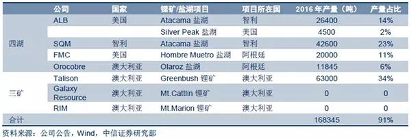 全球鋰資源供應(yīng)高度集中于“四湖三礦”。中信證券的研報(bào)顯示,2016年,全球鋰礦產(chǎn)量折合碳酸鋰當(dāng)量18.4萬噸,其中Talison、SQM、美國(guó)雅寶(ALB)、美國(guó)FMC以及澳大利亞Orocobre五家公司產(chǎn)量占比達(dá)91%,行業(yè)集中度高,資源壟斷格局明顯。