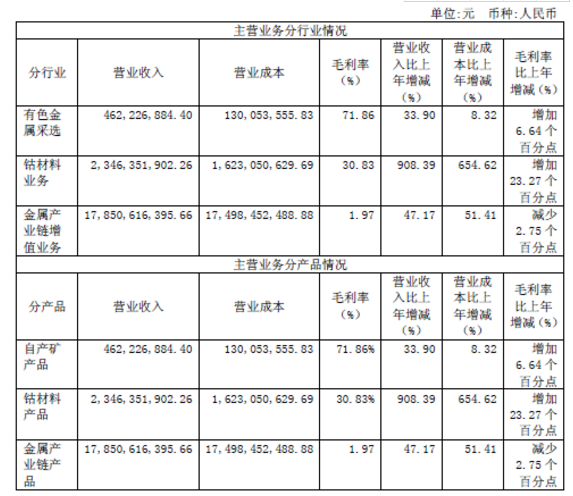 從盛屯礦業(yè)的主營業(yè)務情況我們可以發(fā)現(xiàn),公司在鈷材料業(yè)務和產(chǎn)品領域的營業(yè)收入大幅增長逾9倍,遠遠領先有色金屬采選、金屬產(chǎn)業(yè)鏈增值等其他領域。