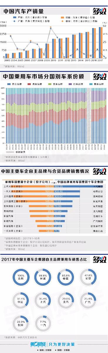 雖然國內(nèi)汽車產(chǎn)銷量全球第一,但是我們自主品牌的市場份額卻不是很高,全年銷售1084.7萬輛,同比增長3%,占乘用車銷售總量的43.9%。根據(jù)中國汽車工業(yè)協(xié)會公布的數(shù)據(jù)顯示,2017年1-10月汽車生產(chǎn)企業(yè)銷量排名前五的均為合資企業(yè),前十的企業(yè)中僅有吉利控股、長安汽車和長城汽車是自主品牌企業(yè)。