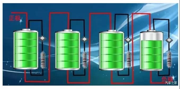那么一旦產(chǎn)生了不均衡,怎么辦呢?這就要用到電池管理系統(tǒng)的均衡模塊。唐和秦的均衡模塊采用的是被動(dòng)均衡方式,也就是說(shuō),通過(guò)旁路電阻給電壓較高的電芯放電,使其達(dá)到和其他電芯相同的電壓。也就是這樣: