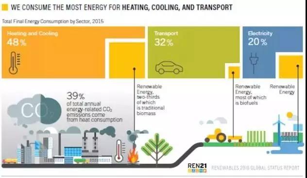 中國儲能網(wǎng)訊:根據(jù)REN21的2018年“全球可再生能源現(xiàn)狀報告”(GSR),2017年可再生能源發(fā)電占到全球發(fā)電量凈增加值的70%。這是現(xiàn)代歷史上可再生能源發(fā)電量增長最大的一年。然而占全球終端能源需求量80%的供熱、制冷和交通領(lǐng)域?qū)τ诳稍偕茉吹氖褂脜s遠遠落后于電力行業(yè)。