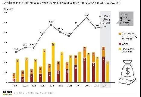目前全球?qū)剂习l(fā)電仍提供大量的補貼,但對新增可再生能源發(fā)電的投資已超過對新增化石燃料和核能發(fā)電投資總和的兩倍以上。由于成本競爭力的提高,2017年可再生能源投資占電力行業(yè)總投資的比例超過三分之二,同時可再生能源在電力行業(yè)的份額仍將會繼續(xù)上升。