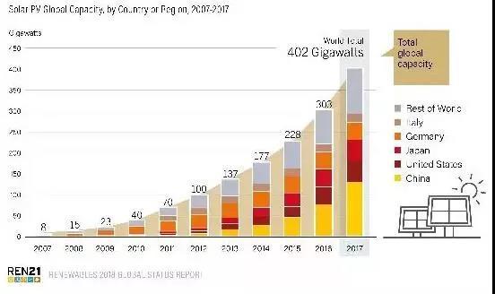 太陽能光伏新增裝機容量達到創(chuàng)紀錄的水平:與2016年相比,太陽能光伏發(fā)電裝機總量增加了29%,達到98GW。光伏新增裝機容量大于燃煤、天然氣和核電凈增裝機容量之和。此外,全球風電新增裝機容量52GW,也對可再生能源總裝機容量起到了擴充作用。