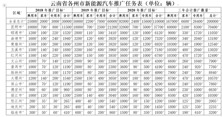 附件1:云南省各州市新能源汽車推廣任務表