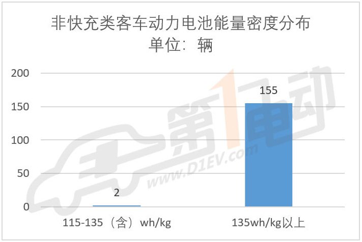 在非快充類純電動(dòng)客車動(dòng)力電池能量密度方面,分布范圍在117.54-152.8Wh/kg之間。按新的補(bǔ)貼調(diào)整方案看,電池能量密度在115-135(含)Wh/kg可拿1倍補(bǔ)貼,135Wh/kg以上可拿1.1倍補(bǔ)貼,這意味著本批目錄中的非快充類客車在能量密度一項(xiàng)拿1.1倍補(bǔ)貼的產(chǎn)品為155款,占比新能源客車總量的85%。