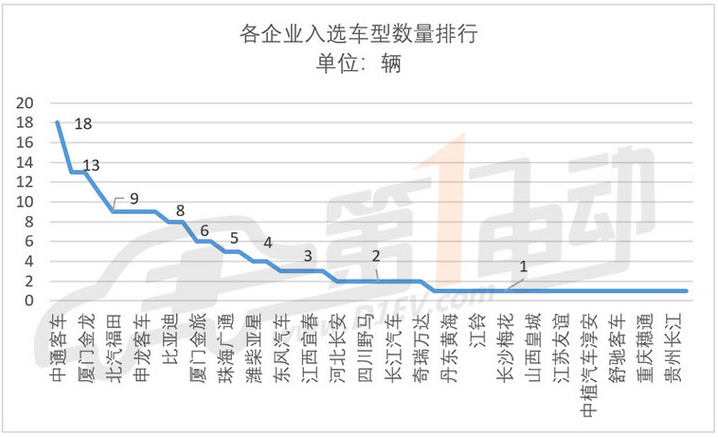 車企方面,本批推薦目錄的183款客車產(chǎn)品來自47家廠商。其中,中通客車、蘇州金龍、廈門金龍分別以18款、13款、13款包攬前三。