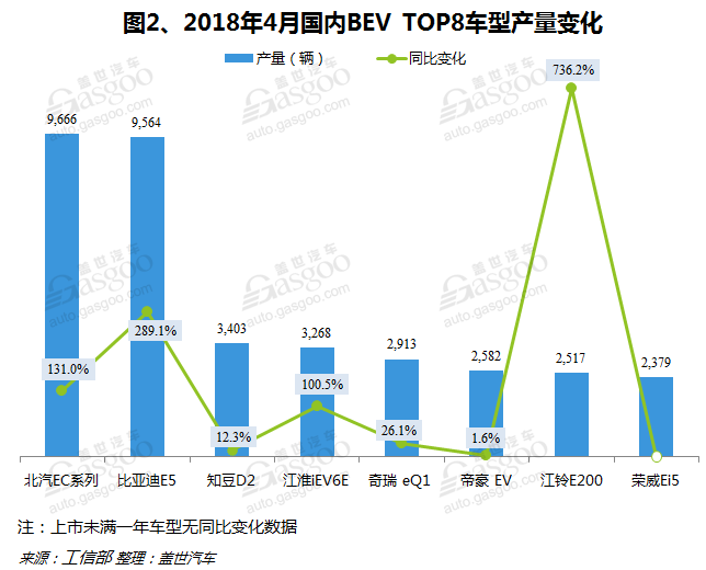 純電動乘用車產(chǎn)量TOP8中比亞迪E5、帝豪EV和榮威Ei5續(xù)航里程均超過300KM。