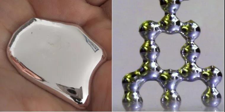 液態(tài)金屬通常是指熔點低于200℃的低熔點合金,其中室溫液態(tài)金屬的熔點更低,在室溫下即呈液態(tài)。自然界存在的室溫液態(tài)純金屬有汞、銫、鈁和鎵,熔點分別是-38.87℃、28.65℃、27℃和29.8℃。汞的揮發(fā)性較大,且有毒,含汞殘余物進入生態(tài)循環(huán)會對人類和環(huán)境造成危害,因此僅限于科學(xué)研究,大規(guī)模生產(chǎn)和應(yīng)用受限。銫和鈁屬于性質(zhì)活潑的堿性金屬,銫在空氣中極易被氧化,和水會發(fā)生劇烈反應(yīng),而鈁則是一種不穩(wěn)定的放射性元素,限制了其應(yīng)用開發(fā)。