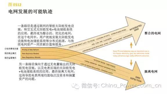 電力系統(tǒng)正處于發(fā)展道路上的一個交叉路口。一條路徑是有利于無電量輸出的太陽能發(fā)電設(shè)施以及太陽能發(fā)電+電池儲能系統(tǒng)的定價結(jié)構(gòu)、商業(yè)模式和監(jiān)管環(huán)境。當(dāng)經(jīng)濟(jì)條件和其它條件達(dá)到臨界點時,這一軌跡的結(jié)果將會是大量用戶脫離大電網(wǎng)。與此同時,隨著擱置電網(wǎng)資產(chǎn)服務(wù)的負(fù)荷將越來越少,電網(wǎng)供應(yīng)電價將面臨螺旋式上升,這會使得太陽能+儲能系統(tǒng)對用戶更具吸引力,從而導(dǎo)致剩余的聯(lián)網(wǎng)用戶的電價水平不可避免的進(jìn)一步升高,形成惡性循環(huán)。這些聯(lián)網(wǎng)用戶包括低收入和固定收入的用戶,他們將承擔(dān)因零售電力定價上漲而帶來的比例失調(diào)的負(fù)擔(dān)。在這一情景下,電網(wǎng)和用戶側(cè)資源都面臨過度建造但利用程度過低的問題,使得電表兩端的資金過剩。另一條路徑則會建立相應(yīng)的定價結(jié)構(gòu)、商業(yè)模式和監(jiān)管環(huán)境,使得太陽能發(fā)電設(shè)施和電池儲能系統(tǒng)等分布式能源,(及其內(nèi)在收益和成本)都被恰當(dāng)?shù)匾暈檎虾蟮碾娋W(wǎng)的有機(jī)組成部分。太陽能發(fā)電設(shè)施和電池儲能系統(tǒng)能潛在地降低整個系統(tǒng)的成本,同時對未來建立可靠的、彈性的、支付得起的低碳電網(wǎng)做出貢獻(xiàn),在這個電網(wǎng)系統(tǒng)里,用戶有權(quán)選擇。在這一情景下,電網(wǎng)和用戶側(cè)資源作為整合的電網(wǎng)的有機(jī)組成部分相輔相成,資金和實體資產(chǎn)的運用效率更高。