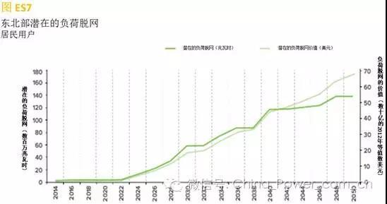 2010年至2030年間,電網(wǎng)將需要金額高達(dá)2萬億美元的投資,或者說每年投資金額達(dá)1000億美元 。 目前,這些投資將通過銷售電量獲得的收入收回。如果支持該投資的銷售電量收入中的一小部分流失掉的話,系統(tǒng)的經(jīng)濟(jì)效益都會受到很大的影響 。值得注意的是,我們的分析顯示,聯(lián)網(wǎng)的太陽能發(fā)電+電池儲能系統(tǒng)將給大量用戶帶來經(jīng)濟(jì)效益,而且這一系統(tǒng)將會向越來越多的用戶供應(yīng)電力。假設(shè)用戶根據(jù)最佳經(jīng)濟(jì)性而選擇電力供應(yīng)方式,則可能發(fā)生大規(guī)模的用戶負(fù)荷脫網(wǎng)。例如,在美國東北部,到15年之后的2030年,對電量銷售的最大侵蝕可能是: