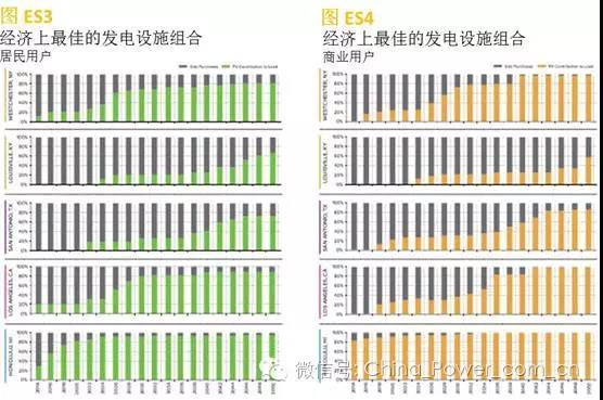 2. 影響:對電力公司、第三方太陽能發(fā)電設(shè)施和電池供應(yīng)商、融資方/投資方、用戶以及其它電力系統(tǒng)利益相關(guān)方有哪些影響?另外,聯(lián)網(wǎng)的太陽能發(fā)電+電池儲能系統(tǒng)還會帶來哪些機(jī)會?我們在能代表不同電力價格水平和太陽能資源強(qiáng)度的五個城市里,對中等消費水平的商業(yè)和居民用戶直至2050年的經(jīng)濟(jì)性進(jìn)行了分析。我們對僅有電網(wǎng)、電網(wǎng)+太陽能發(fā)電、電網(wǎng)+太陽能發(fā)電+電池儲能系統(tǒng)三種配置情景做了模型分析并預(yù)測,確定隨著時間推移最具成本效益的選項(基于等效能源的系統(tǒng)平準(zhǔn)化度電成本)。我們也研究了在最優(yōu)成本效益的選項下,電網(wǎng)供電和自供電模式占比將會有怎樣的變化。對于太陽能發(fā)電設(shè)施及太陽能發(fā)電+電池儲能系統(tǒng)的配置,我們的模型分析是以自我消費為主,無電量輸出補(bǔ)償?shù)南到y(tǒng)(即在電表后端進(jìn)行優(yōu)化)。盡管在多數(shù)地區(qū)已有通過電費積分或直接支付(例如,凈電量計量、上網(wǎng)電價補(bǔ)貼、可避免的燃料成本補(bǔ)償?shù)刃问剑﹄娏枯敵鲞M(jìn)行補(bǔ)償,而且會提高本文所述的經(jīng)濟(jì)效益,然而為了理解在最極端情況下的經(jīng)濟(jì)影響,我們對輸出電量做了保守假設(shè),即沒有電費積分或直接補(bǔ)償。