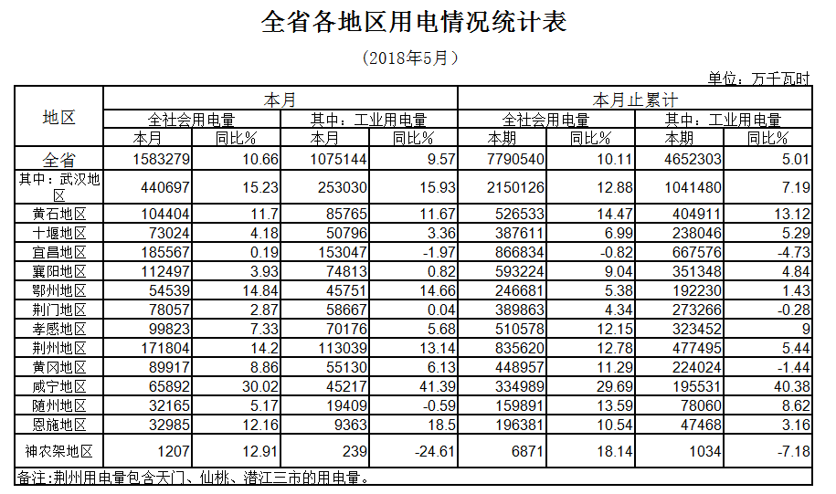 (五)各地區(qū)全社會(huì)用電普遍增長(zhǎng),一半地區(qū)用電增速在兩位數(shù)以上。5月份,全省14個(gè)用電統(tǒng)計(jì)地區(qū)全社會(huì)用電普遍增長(zhǎng),其中武漢、黃石、荊州、咸寧等7個(gè)地區(qū)全社會(huì)用電增幅超過(guò)兩位數(shù)。從工業(yè)用電情況看,11個(gè)地區(qū)用電不同程度增長(zhǎng),其中武漢等6個(gè)地區(qū)工業(yè)用電增速超過(guò)兩位數(shù),僅宜昌、隨州、神農(nóng)架林區(qū)3地下降。
