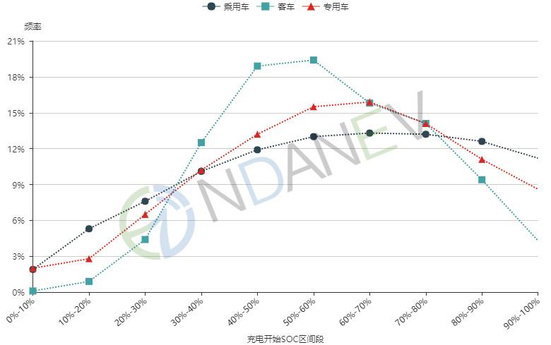 分類別看,不同類別新能源車輛充電開始SOC差異化分布。新能源乘用車充電開始SOC相對分散,其分布位于30%-90%范圍;新能源客車充電開始SOC集中在50%-60%區(qū)間內(nèi);新能源專用車充電開始SOC集中在60%-70%(如圖1所示)。數(shù)據(jù)表明,運營車輛充電相對規(guī)律和集中,而乘用車由于應用領(lǐng)域廣,個性化差異大,充電分布較為均勻。