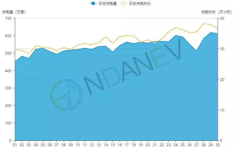 從日總充電量和充電時長來看,4月份新能源汽車日總充電量在400-600萬度之間,日總充電時長在30-40萬小時(如圖2所示),充電量和充電時長較3月份均有大幅度提高。同時,結(jié)合充電量和充電時長曲線,可以看出總充電量變化與充電時長變化曲線較為一致,具有正相關(guān)性,這表明慢充是當下新能源汽車充電的主要形式,偶爾才會出現(xiàn)快充集中現(xiàn)象。