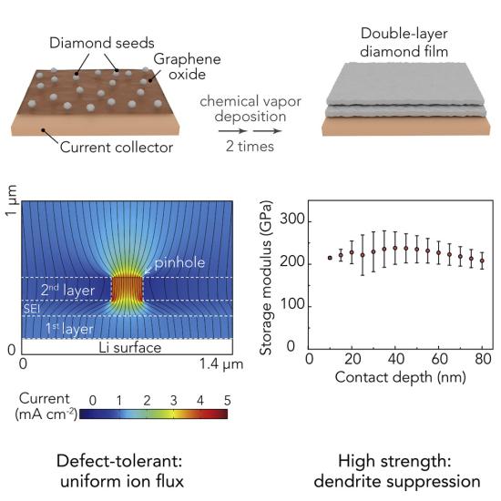 納米金剛石薄膜不僅具有優(yōu)異的電化穩(wěn)定性,而且具有抑制鋰枝晶的極高模量。由于表面保護(hù)層的針孔會(huì)破壞離子流量的均勻性,斯坦福研究人員開發(fā)出了獨(dú)特的雙層結(jié)構(gòu)來(lái)彌補(bǔ)設(shè)計(jì)缺陷,也就是,一層中的缺陷可通過(guò)另一完整層來(lái)篩誤。