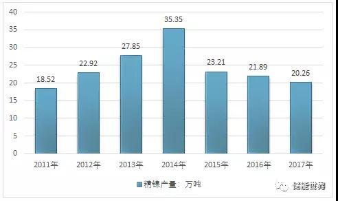 2015年我國鎳精礦(鎳含量)產(chǎn)量約9.29萬噸,同比2014年的10萬噸下降了7.1%。2016年我國鎳精礦產(chǎn)量下降到9萬噸,2017年我國鎳礦產(chǎn)量為9.44萬噸,2017年同期我國精鎳產(chǎn)量達(dá)到20.26萬噸。