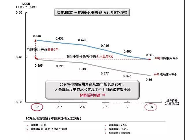 由以上計(jì)算結(jié)果可知,如果將組件壽命從25年延長到30年,度電成本就能下降0.043元/千瓦時(shí),在2.8元的組件價(jià)格下已經(jīng)基本實(shí)現(xiàn)了平價(jià)上網(wǎng)!而組件價(jià)格下降0.1元/W,電站度電成本僅下降0.006元/千瓦時(shí);為了達(dá)到平價(jià)上網(wǎng),組件價(jià)格需要大幅下降1元/W。在推動(dòng)度電成本下降方面,延長電站壽命遠(yuǎn)比下調(diào)組件價(jià)格成效大。光伏系統(tǒng)運(yùn)行越久,電力成本就越低,就可以獲得更高的投資回報(bào)。如果能將電站使用壽命從25年延長到30年,可以大幅降低度電成本,提前實(shí)現(xiàn)平價(jià)上網(wǎng)。可以說,30年品質(zhì)等于加速推動(dòng)平價(jià)上網(wǎng),平價(jià)上網(wǎng)可以最終不依賴補(bǔ)貼而得以實(shí)現(xiàn)。