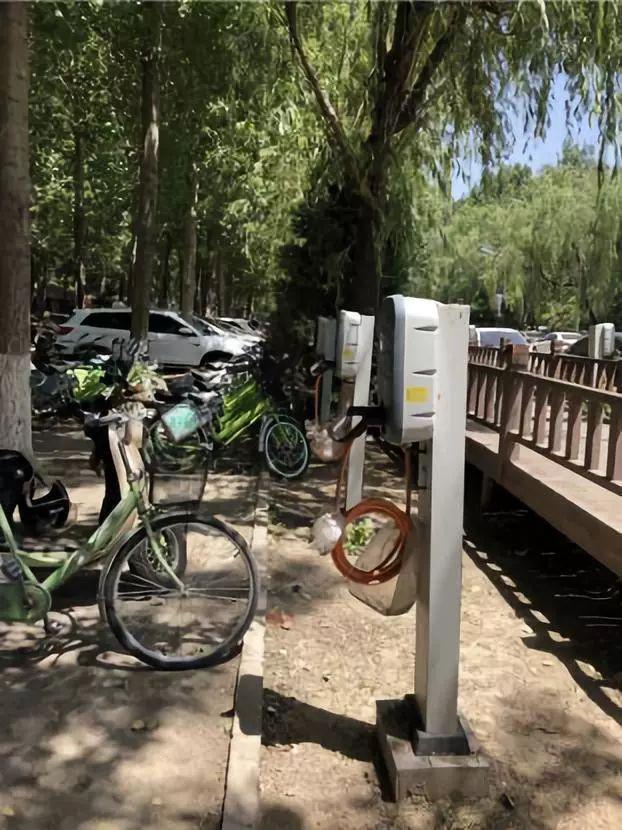 反復被用戶詬病的充電樁問題,在這里同樣無一幸免。許多充電樁的接口被灰塵和柳絮堵塞,長久無人使用。在靠近出口的地方雖然也有一些新能源汽車在充電,但大多被燃油車、共享單車占用了停車位,無法使用的充電樁也隨處可見。