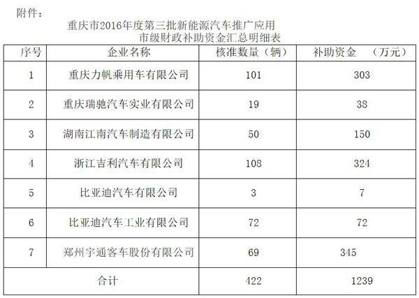 重慶市經(jīng)濟和信息化委員會關于2016年度第三批新能源汽車推廣應用市級財政補助資金的公示