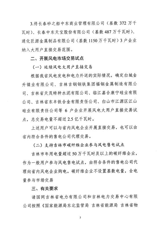 延續(xù)風(fēng)電大用戶直接交易,同時(shí)吉林市年用電量50萬(wàn)千瓦時(shí)及以上的碳纖維企業(yè)作為一般電力用戶由售電公司代理參與風(fēng)電售電試點(diǎn),可以全電量參與市場(chǎng)交易。