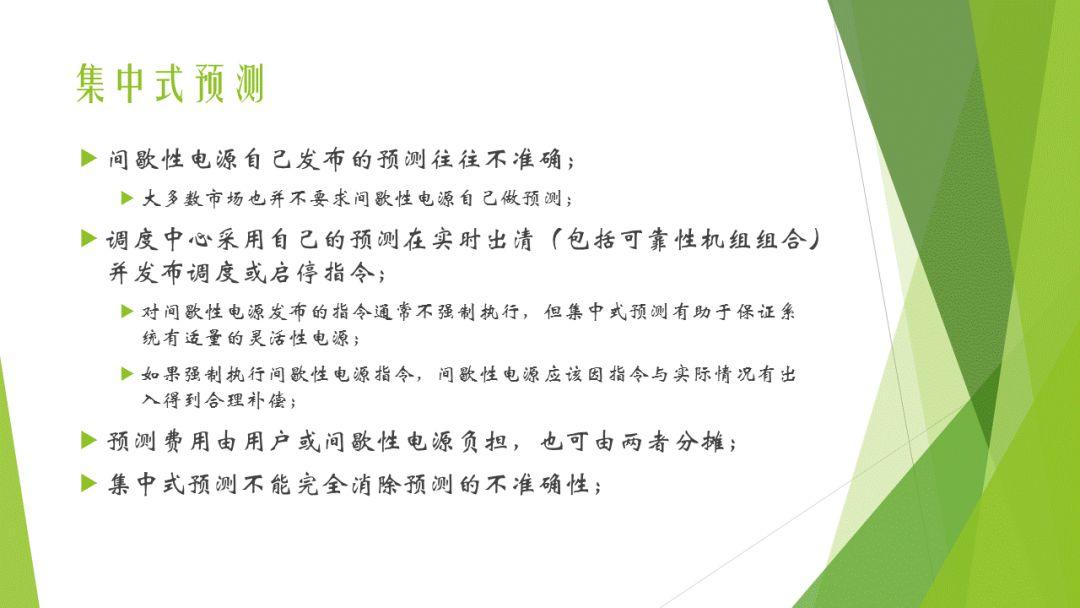 對間歇性電源,可以采用由調(diào)度機(jī)構(gòu)統(tǒng)一預(yù)測的方式以提高預(yù)測精度。多個電力市場采用這種方法。預(yù)測成本可以由市場通過一定方式分?jǐn)偝鋈ァ?