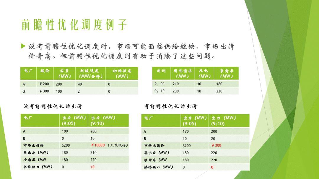 沒有前瞻性優(yōu)化的情況下,在9:05,電廠A出力為180MW,電廠B出力為零。到9:10,A可以增加出力20MW到200MW,B可以增加出力10MW,總共增加30MW,但負(fù)荷在9:05到9:10之間增加了40MW,一些負(fù)荷無法滿足,所以啟動了市場最高限價——天花板價10000¥/MW。