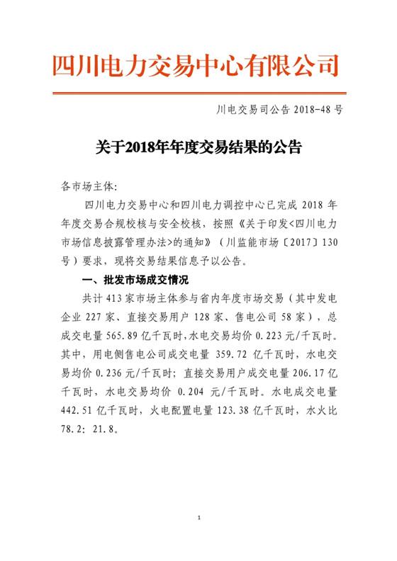 四川電力交易中心和四川電力調(diào)控中心已完成2018年年度交易合規(guī)校核與安全校核,按照《關(guān)于印發(fā)<四川電力市場信息披露管理辦法>的通知》(川監(jiān)能市場〔2017〕130號)要求,現(xiàn)將交易結(jié)果信息予以公告,詳見附件。