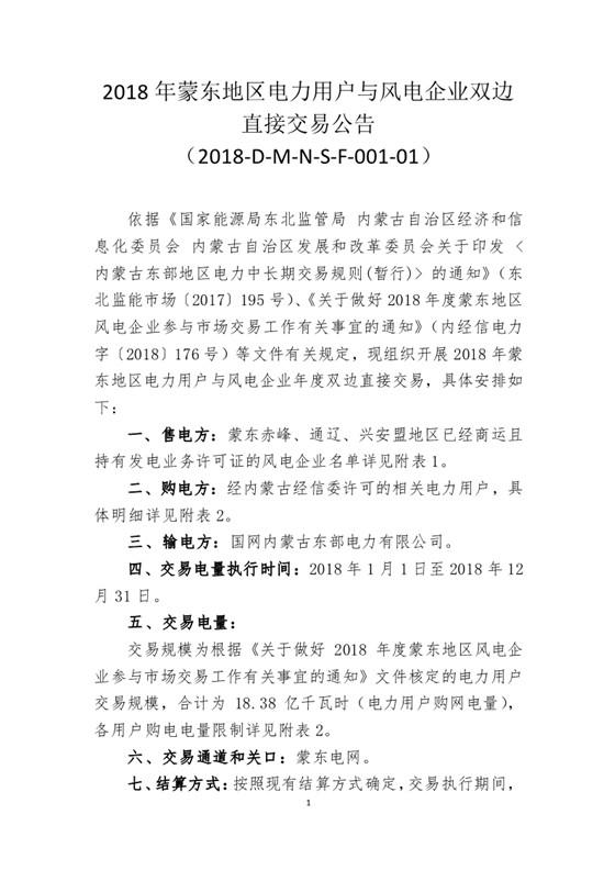 中國(guó)儲(chǔ)能網(wǎng)訊:北京電力交易中心發(fā)布了《2018年蒙東地區(qū)電力用戶與風(fēng)電企業(yè)雙邊直接交易公告》,7月6日-7月16日組織開(kāi)展2018年電力用戶與風(fēng)電企業(yè)年度雙邊直接交易,交易規(guī)模合計(jì)為18.38億千瓦時(shí)。詳情如下: