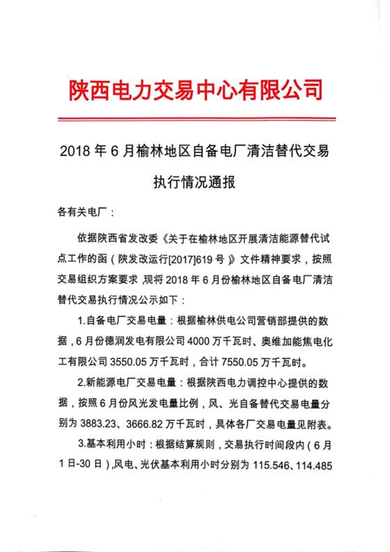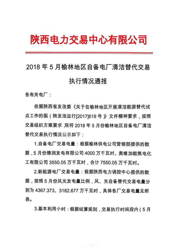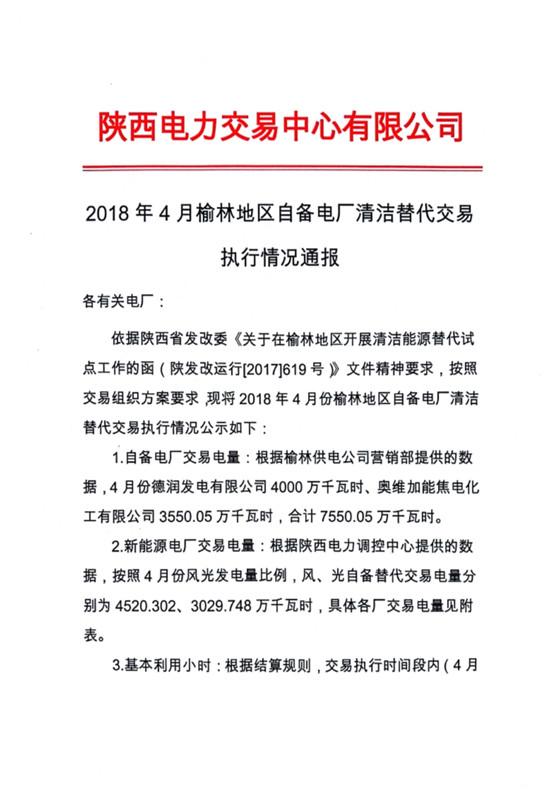 2018年4-6月榆林地區(qū)自備電廠清潔替代 交易執(zhí)行情況通報(bào)