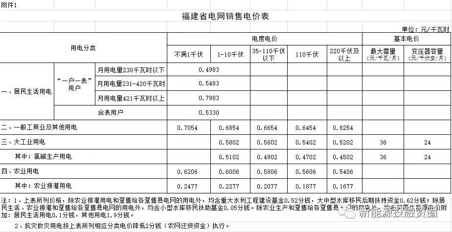根據(jù)福建省物價局2018年6月15日發(fā)布的《福建省物價局關(guān)于電力行業(yè)增值稅稅率調(diào)整相應(yīng)降低一般工商業(yè)電價有關(guān)事項的通知》(閩價商〔2018〕115號),根據(jù)《國家發(fā)展改革委關(guān)于電力行業(yè)增值稅稅率調(diào)整相應(yīng)降低一般工商業(yè)電價的通知》(發(fā)改價格〔2018〕732號),經(jīng)省政府領(lǐng)導(dǎo)同意,現(xiàn)就降低我省一般工商業(yè)電價有關(guān)事項通知如下:適當(dāng)降低我省一般工商業(yè)及其他用電目錄銷售電價,適當(dāng)降低我省一般工商業(yè)及其他用電輸配電價,調(diào)整后價格如下,從2018年5月1日起執(zhí)行。