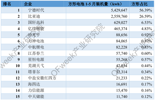 為了更好了解方形動力電池廠家的情況,OFweek產(chǎn)業(yè)研究院初步列出了1-5月份方形動力電池排名前十的企業(yè)的部分電芯和PACK情況,以供參考。