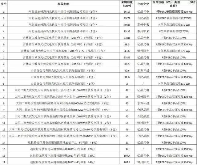 7月6日,國家電投公示了用于海興、壽陽、大同二期、達拉特、白城五大領跑基地共計1.338GW的組件中標結果。最終五家企業(yè)瓜分了此次超過1.2GW的領跑者組件訂單,分別為億晶光電(511MW)、合肥晶澳(238MW)、錦州陽光(228MW)、泰州中來(144MW)、東方環(huán)晟(120MW)。