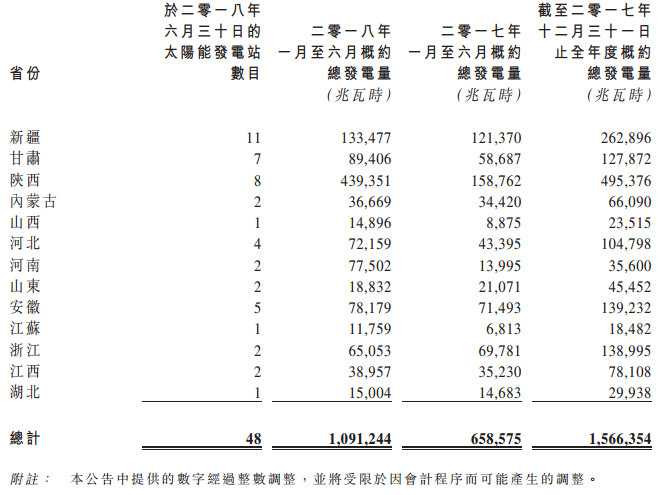中國儲能網(wǎng)訊:7月13日,江山控股發(fā)布的1-6月太陽能發(fā)電發(fā)電量概要顯示,根據(jù)公司現(xiàn)有的初步營運統(tǒng)計數(shù)據(jù),集團擁有的太陽能發(fā)電站于2018年1月至6月的總發(fā)電量約為1,091,244兆瓦時,較去年同期約658,575兆瓦時大幅上升約66%。集團于2018年6月30日的總裝機量達1,819.3兆瓦。