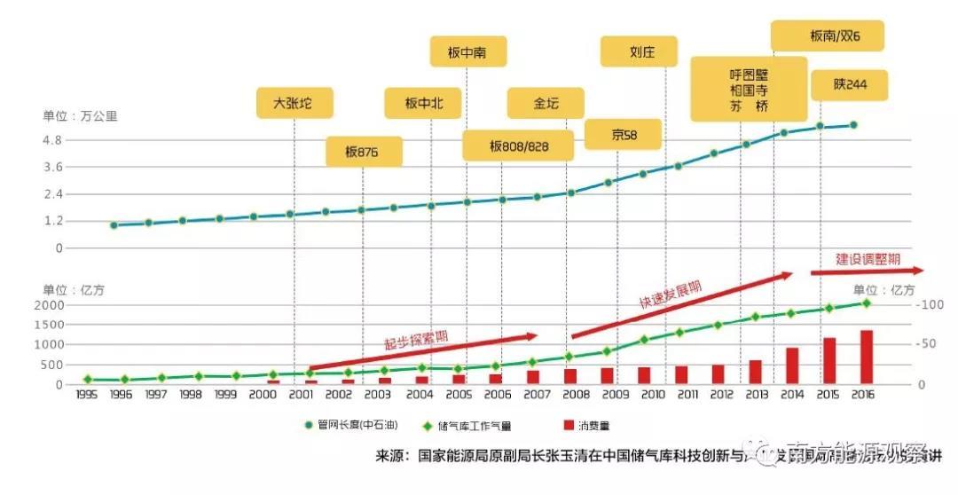 中國的儲氣調(diào)峰能力建設(shè)啟動(dòng)于1999年,隨著西氣東輸?shù)忍烊粴忾L輸管道建設(shè)及天然氣工業(yè)發(fā)展而發(fā)展,歷經(jīng)起步探索期和快速發(fā)展初期兩個(gè)階段。中國首次大規(guī)模采用儲氣庫調(diào)峰,始于陜京輸氣管道工程。為了解決北京市季節(jié)用氣不均衡的問題,保證向北京市穩(wěn)定供氣,1999年,中石油修建了大港油田大張坨地下儲氣庫。大港儲氣庫除了向北京供氣以外,還有部分天然氣供應(yīng)天津、河北滄州等地。為保證供氣安全,2001年來,繼大張坨地下儲氣庫后,中石油又陸續(xù)建成了板876地下儲氣庫和板中北高點(diǎn)地下儲氣庫。