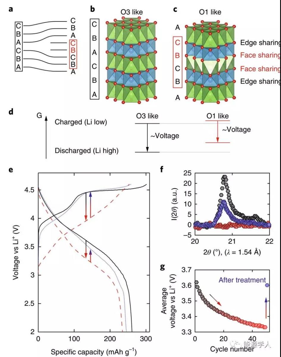 圖5. 恢復(fù)富鋰氧化物材料中的電壓的路徑。(a-c)由部分位錯誘導(dǎo)的氧層堆積修飾的示意圖,由部分位錯誘導(dǎo)的氧層堆積修飾的示意圖(a),兩個額外的氧層O3序列ABCABC(b)分解O1樣序列ABC BC ABC(c);(d)在吉布斯自由能圖中,邊緣共享八面體導(dǎo)致能量上最有利的配置。(e)Li-金屬作為陽極的富鋰層狀陰極的充放電電壓曲線;(f)在50個循環(huán))以及在熱處理之后結(jié)構(gòu)峰強度的演變;(g)在2032型半電池中測量的前50個循環(huán)(黑色至紅色符號)和熱處理后(藍(lán)色符號)的平均放電電壓,處理后恢復(fù)放電電壓。